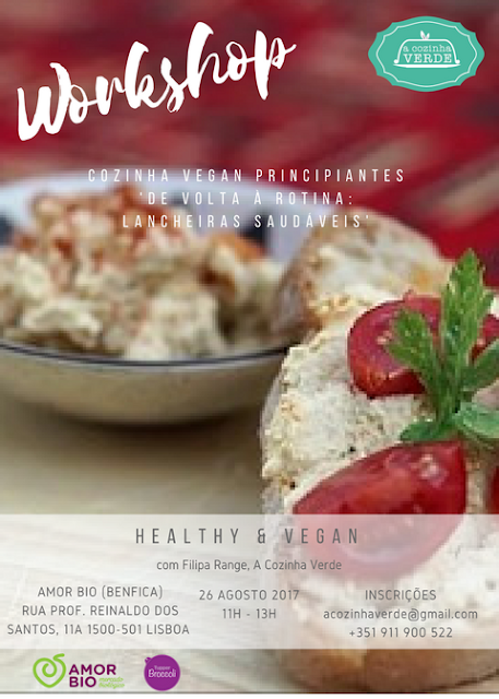 O Workshop | Cozinha vegan principiantes – De volta à rotina: Lancheiras saudáveisEste workshop destina-se a quem está a iniciar-se no mundo da alimentação vegetariana, aos que precisam de uma motivação extra para começar, ou para quem quer simplesmente introduzir algumas refeições vegetarianas saudáveis no seu dia-a-dia.Neste workshop, vão aprender a confeccionar lancheiras rápidas e saudáveis para o dia-a-dia. Refeições simples, deliciosas e sempre muito nutritivas, para preparar de véspera ou congelar! Tudo 100% vegetal.Serão duas horas de workshop, mais degustação, com confeção de receitas e muitas dicas e conselhos relacionados com a alimentação e estilo de vida vegan.Tema: COZINHA VEGAN PRINCIPIANTES – De volta à rotina: Lancheiras saudáveisLocal: AMOR BIO (Benfica) Rua Prof. Reinaldo dos Santos, 11A 1500-501 LisboaValor: 20€ (inclui workbook com as receitas e dicas + degustação + ofertas aos participantes)Data: 26 de Agosto, SábadoHorário: 11h00 – 13h00Inscrições/informaçõesacozinhaverde@gmail.com911900522ParceirosEste evento conta com o apoio do Amor Bio – mercado biológico e com a participação especial da Tupper Broccoli que nos vai trazer muitos mimos para oferecer aos participantes!